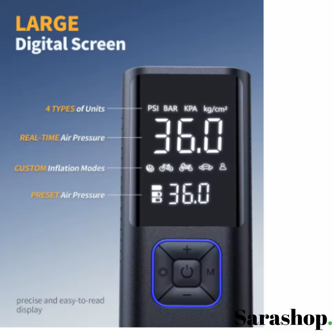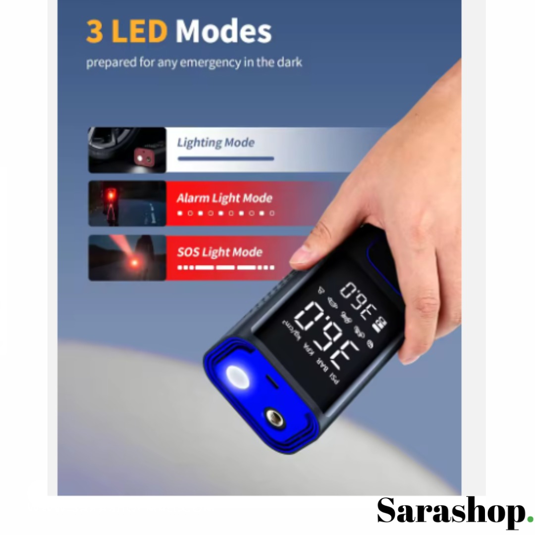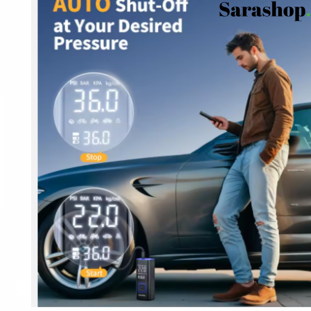 La bonne pression partout, sans effort. Compact et léger. Il se glisse dans la boîte à gants, un sac ou le coffre. Prêt en quelques secondes pour voiture, moto, vélo et ballons. Réglez la pression voulue. L'appareil s’arrête automatiquement au niveau exact. Pas de surgonflage. Plus de sécurité et une conduite plus stable. Grand écran numérique très lisible. Affichage en temps réel et pression cible en un coup d’œil. Quatre unités au choix : PSI, BAR, KPA, kg/cm². Modes préréglés par type de véhicule pour aller encore plus vite. Lampe LED intégrée. Mode éclairage pour viser la valve la nuit. Mode alerte pour être visible. Mode SOS en cas d’imprévu. Utilisation express. Branchez le tuyau. Choisissez l’unité et le mode. Sélectionnez la pression. Appuyez. Il s’arrête tout seul quand c’est parfait. Contenu de la boîte : Gonfleur , Tuyau d’air , Embouts de gonflage et aiguille , Câble de charge. matériaux = ABS. dimensions: L=15,5 cm; l=7,8 cm; H=5,7 cm. tension = 12 V. affichage = numérique. cylindre = simple. fonctions = arrêt automatique, modes préréglés, indicateur de batterie, LED 3 modes. Commandez maintenant. Payez à la livraison. Besoin d’un conseil. Nous sommes à votre disposition.